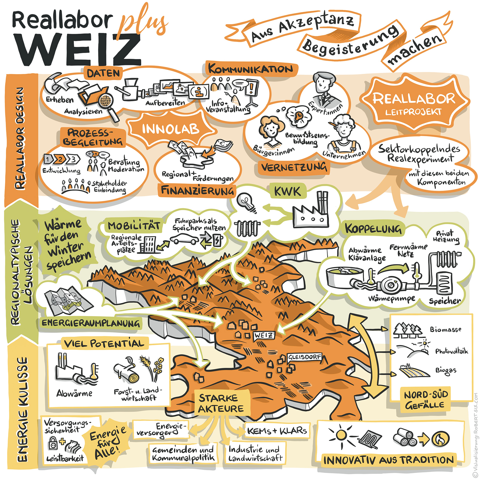 Das Reallabor WEIZplus gestaltet die regionale Energiewende aktiv und aus einer Hand, indem die Energieversorgung schrittweise auf 100 % erneuerbare, lokal erzeugte Energie umgestellt wird und gleichzeitig die regionale Wertschöpfung gestärkt wird. Ein besonderer Fokus des Reallabors liegt auf konkreten Modelllösungen, wie Industrie- und Gewerbebetriebe erfolgreich aus der fossilen Energieversorgung aussteigen können.